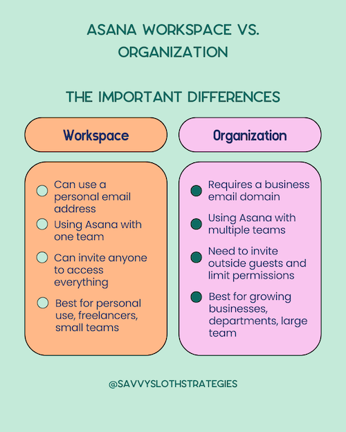 An Organization is designed for businesses and larger teams that need to manage multiple projects, departments, or teams all within one Asana account. The structure is tied to a business email domain like @yourcompany.com and offers more flexibility as your team grows.