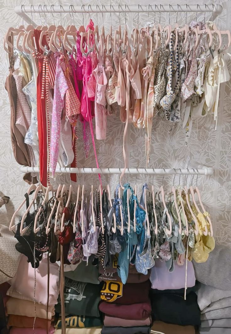 What I love most about this approach is how visual it is. You can see your entire personal swimsuit collection at a glance, which makes getting dressed way easier and honestly makes it feel a little like shopping your own closet. It's also fairly low maintenance, which is a non-negotiable for me. Toss it on, pull it off, no digging through a drawer or untangling a twisted tie top.