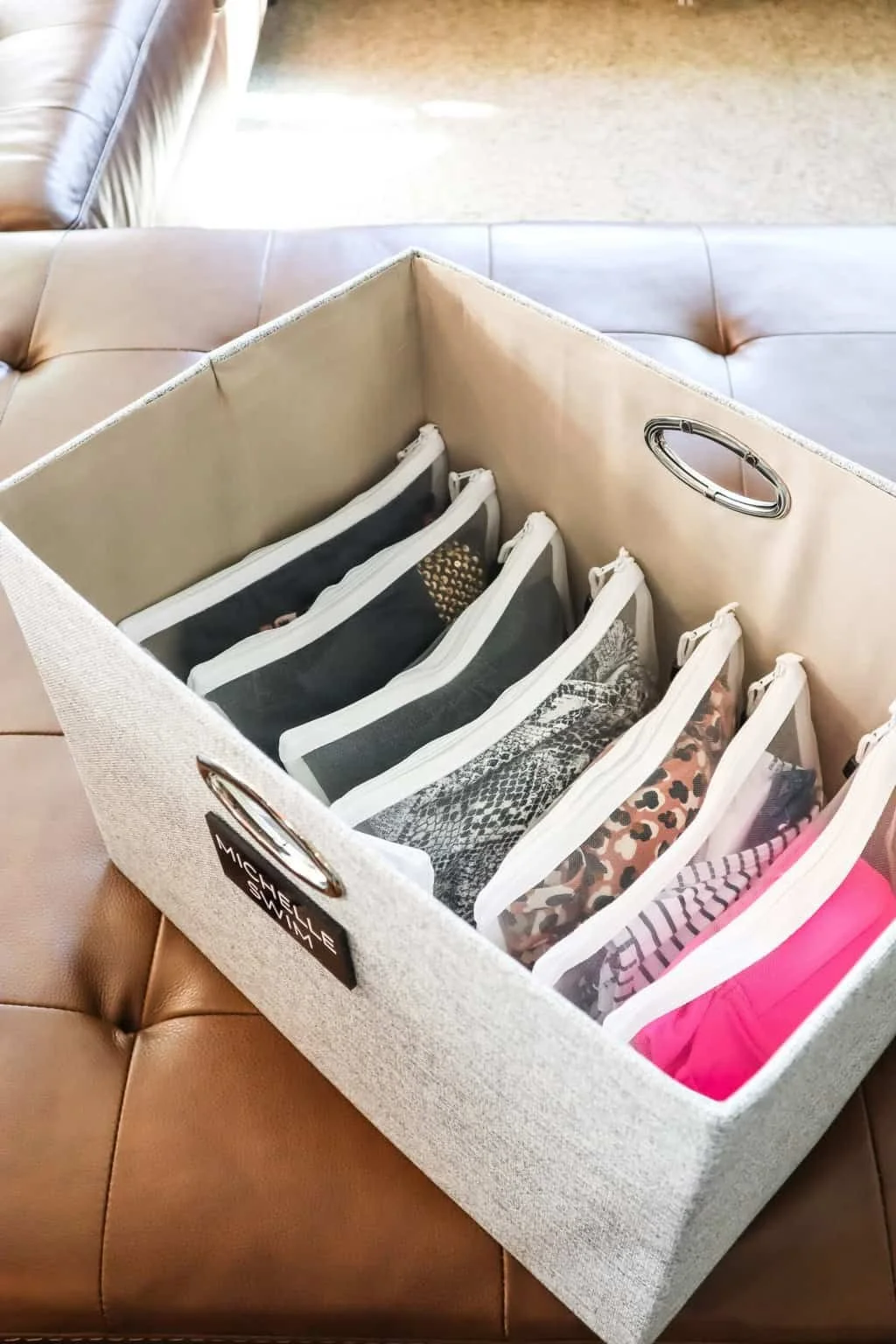 The idea is simple: store each bathing suit (or set of bikini tops and bottoms) inside its own clear bag or small clear pouch. Then "file" the pouches upright in a drawer organizer or basket so you can flip through them like folders. Want the one with the animal prints? Pull it out. Done with it? Zip it up, file it back.